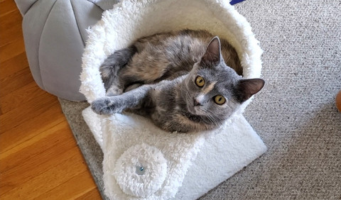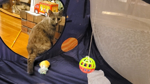 Tsuki was a goofy nut like usual. She climbed onto bags of Perler beads, finding it comfy, she tried to squeeze into the cat bed my mom bought her that was too small, she attacked me from underneath the blanket, she played with toys in her bed, she tried to climb walls, and so much more. Tsuki also loves to stare at people. I'll be minding my own business, usually reading on the couch, and she'll appear and continuously stare at me. She's such a peculiar, little kitty. She can be the physical embodiment of boundless energy; she chased bells all around the house, up and down the stairs, losing them everywhere. Luckily enough for her, I happened to find more bells at the store after weeks of them being sold out; I had been checking every time I was out, but they had been out of them for the longest. I had 80, and there's probably about 20 left that hadn't been lost. Tsuki's such a goof, but she's adorable; we love her so.