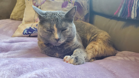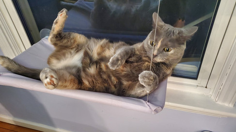 Tsuki had a fairly normal week, enjoying getting cozy inside while it's bitterly cold outside. She's been having lots of fun playing with gift bags, tissue paper, and gift wrap (she's claimed my empty birthday bag as her own--she hasn't claimed my new Sesshomaru sweater-hoodie thing yet, but I can easily see her doing so in the future). Tsuki enjoyed being cozy by the fire, playing in boxes, lounging on her window shelf, snoozing on the couch, napping on the chair, engaging in sneak attacks and antics, and just being her typical, goofy self. She was bummed out that I had some last minute pet sitting come up Friday and Saturday, but she was happy to have me back home. It's also good to be home; there's no place like home with Tsuki!