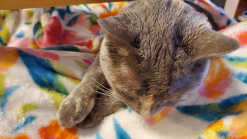 Tsuki was her normal goofy self, but she was definitely feeling the strange energies because she slept a lot this week. Granted, it's not like she never sleeps, but she's practically the Energizer bunny and keeps going and going and going, bouncing off the walls. She was also rather miffed because the remodelers came back, meaning she was confined against her will. Although, she was quite happy to snuggle up with me and a blanket and sleep.