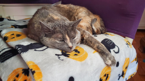 Tsuki was her typical, adorable, goofy self and lived her best kitty life (aside from when she was in hiding when people were noisily working on the AC). She spent plenty of time enjoying cozy cat naps, relaxing on her favorite chair, snuggling with me, lounging on her window shelf, birdwatching from the couch and her window shelf, sprawling out on the rug, snoozing in her cat house, playing in boxes and with bells, and getting into plenty of antics and shenanigans. Tsuki can be quite the wild card; you can't truly predict what she'll do (although, you can "summon" her by shaking and ringing the bells she loves to play with). She's just so cute and funny; gotta love having her around!